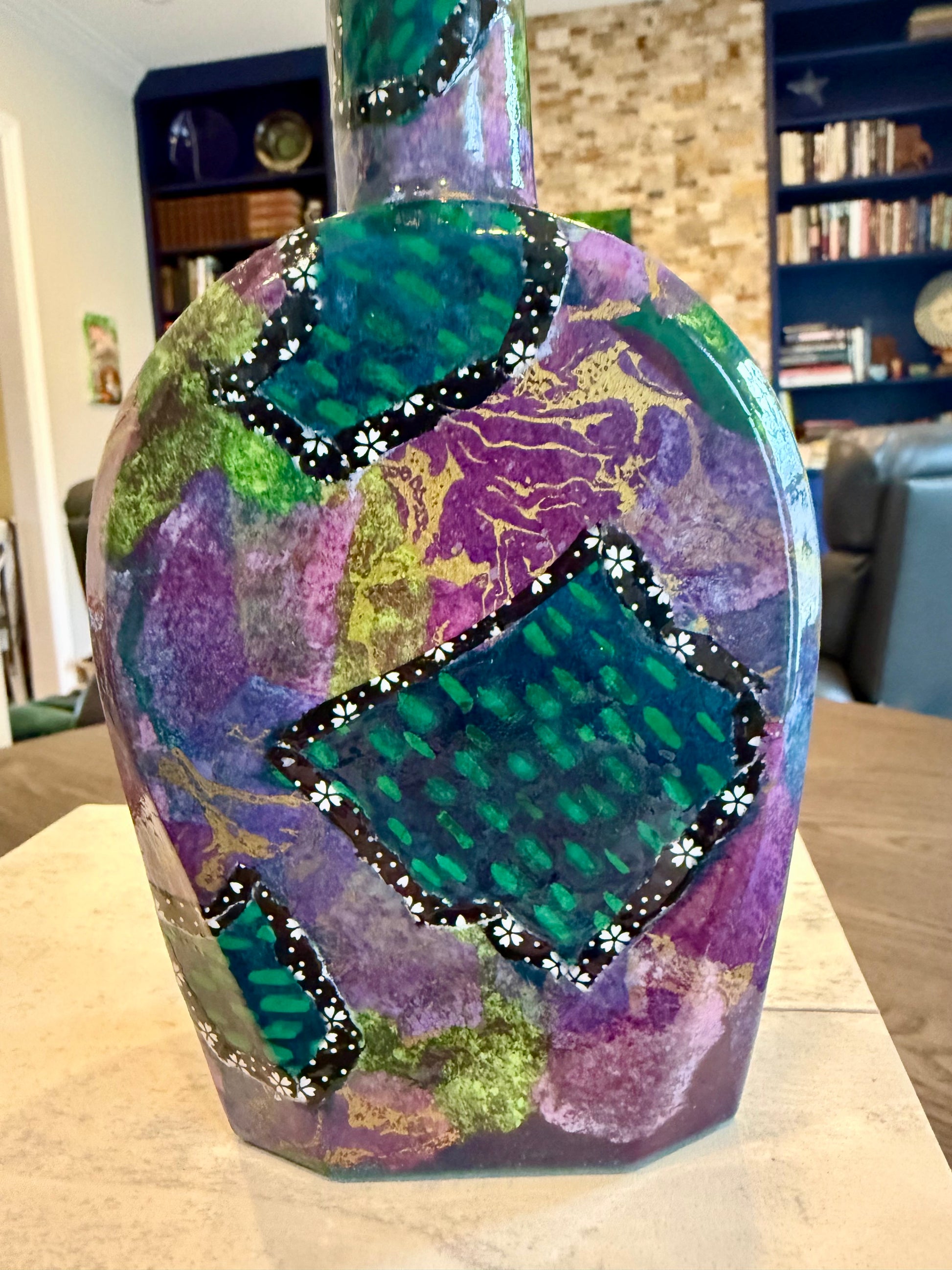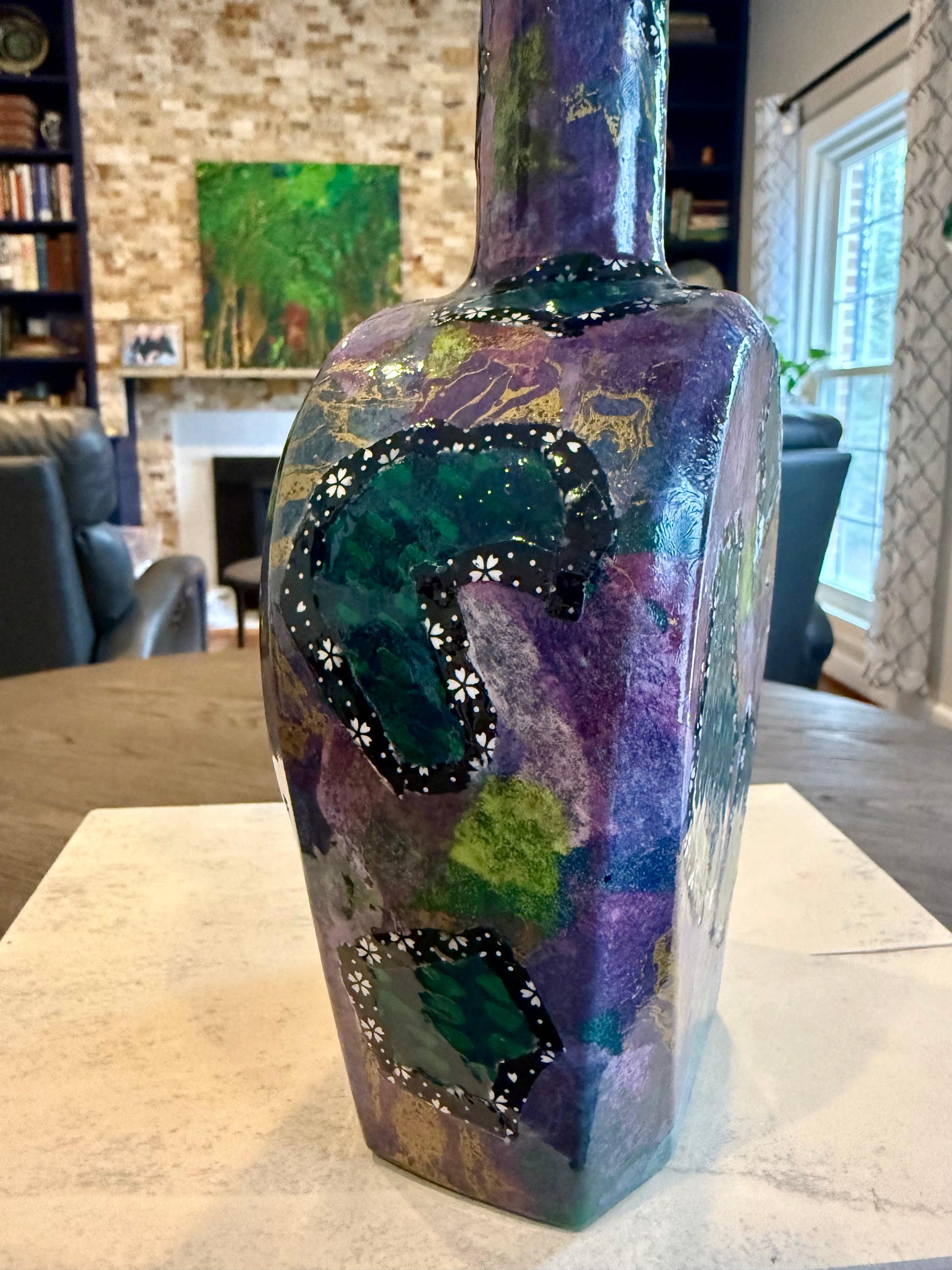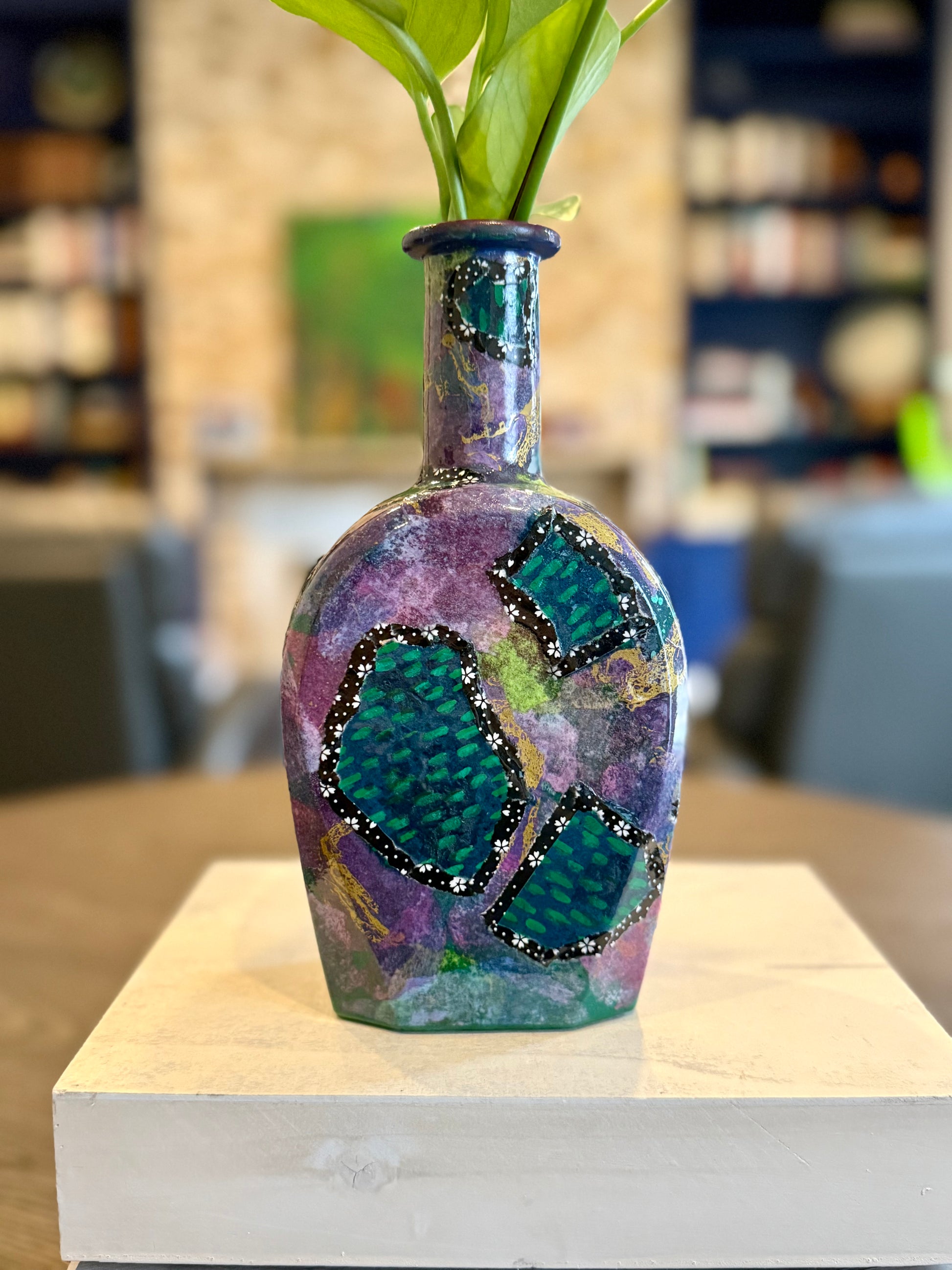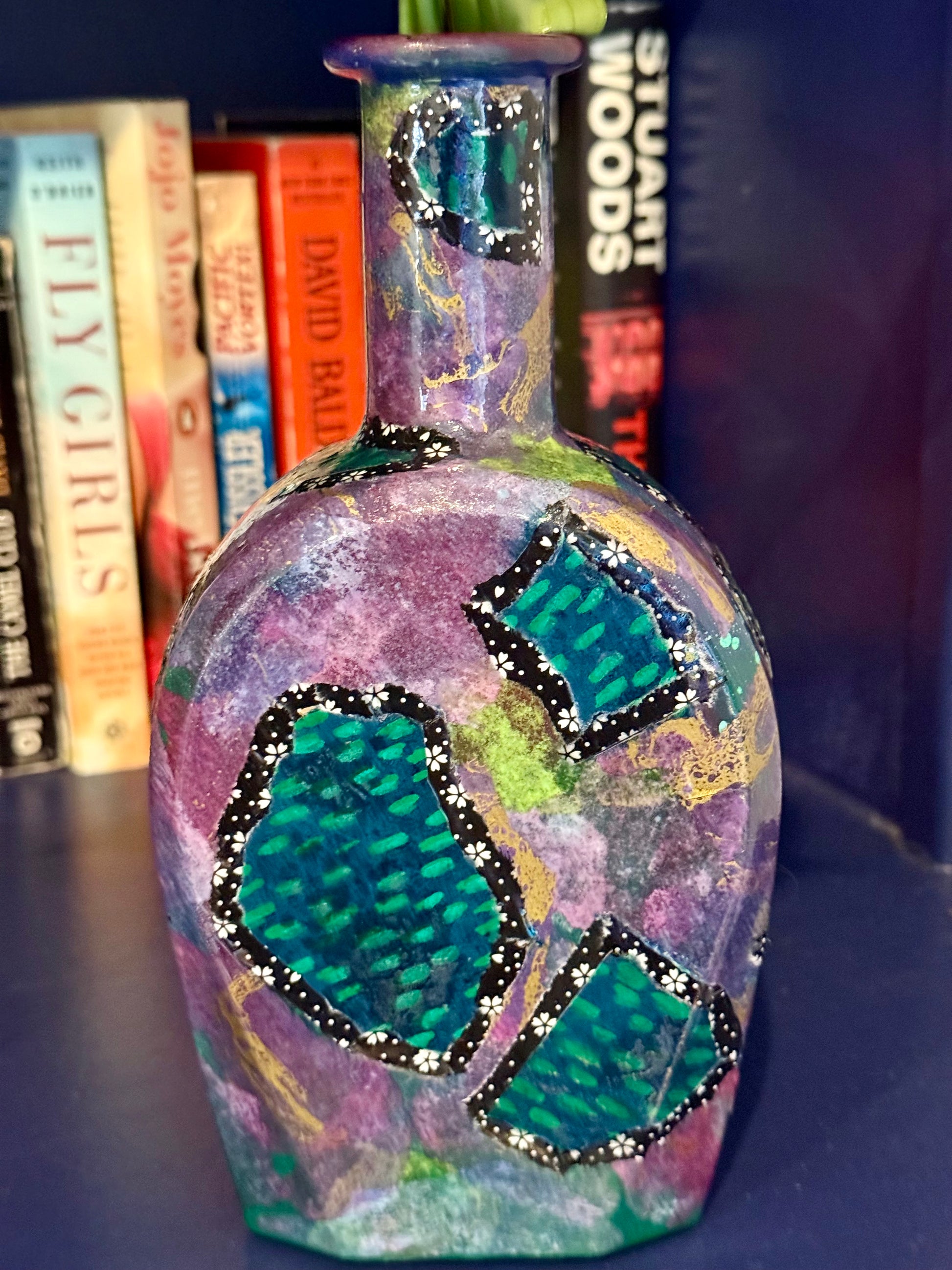 I have repurposed this bourbon bottle as a lively, maximalist flower vase with the help of colorful acrylic paint and scraps of paper.
