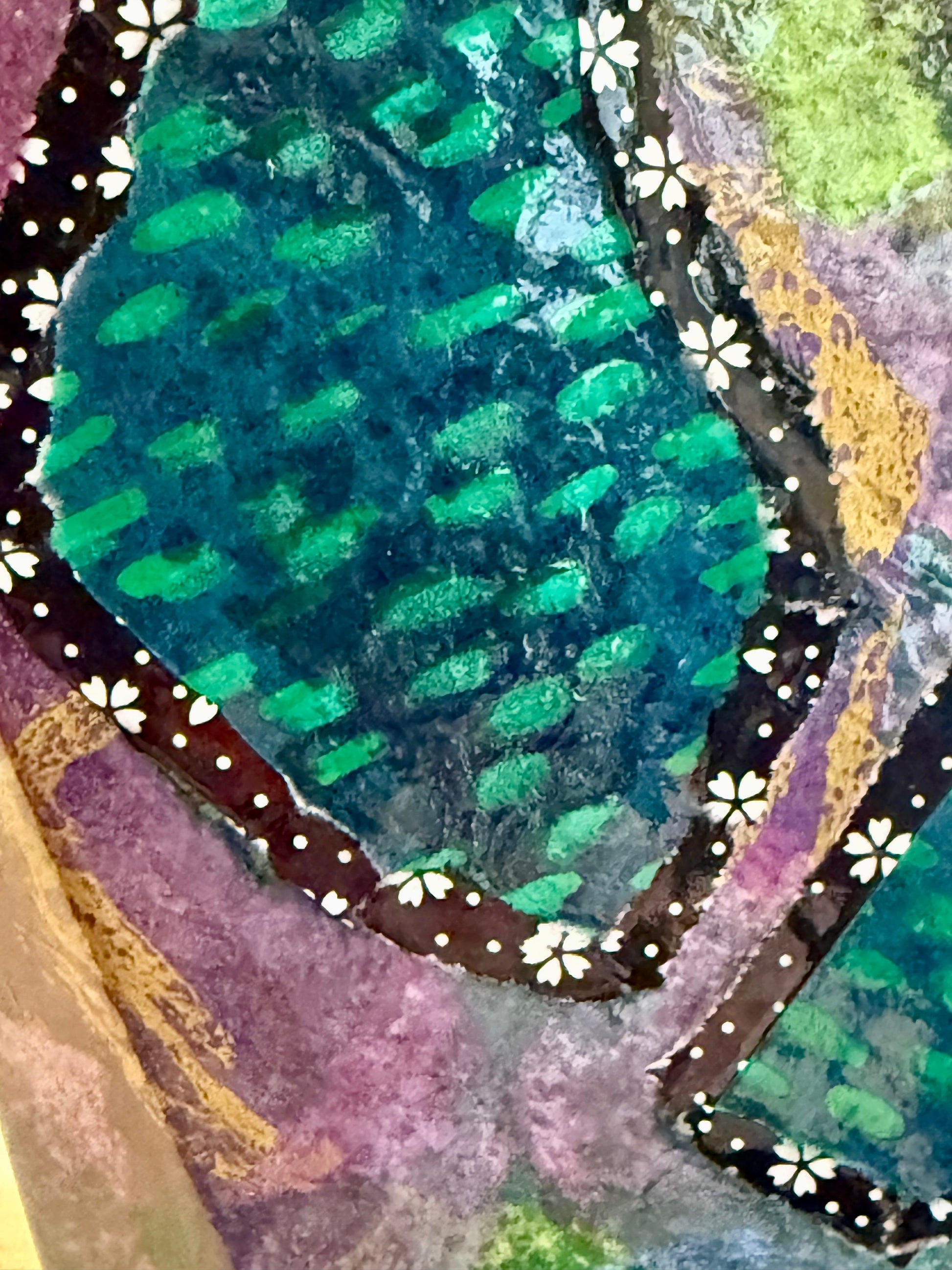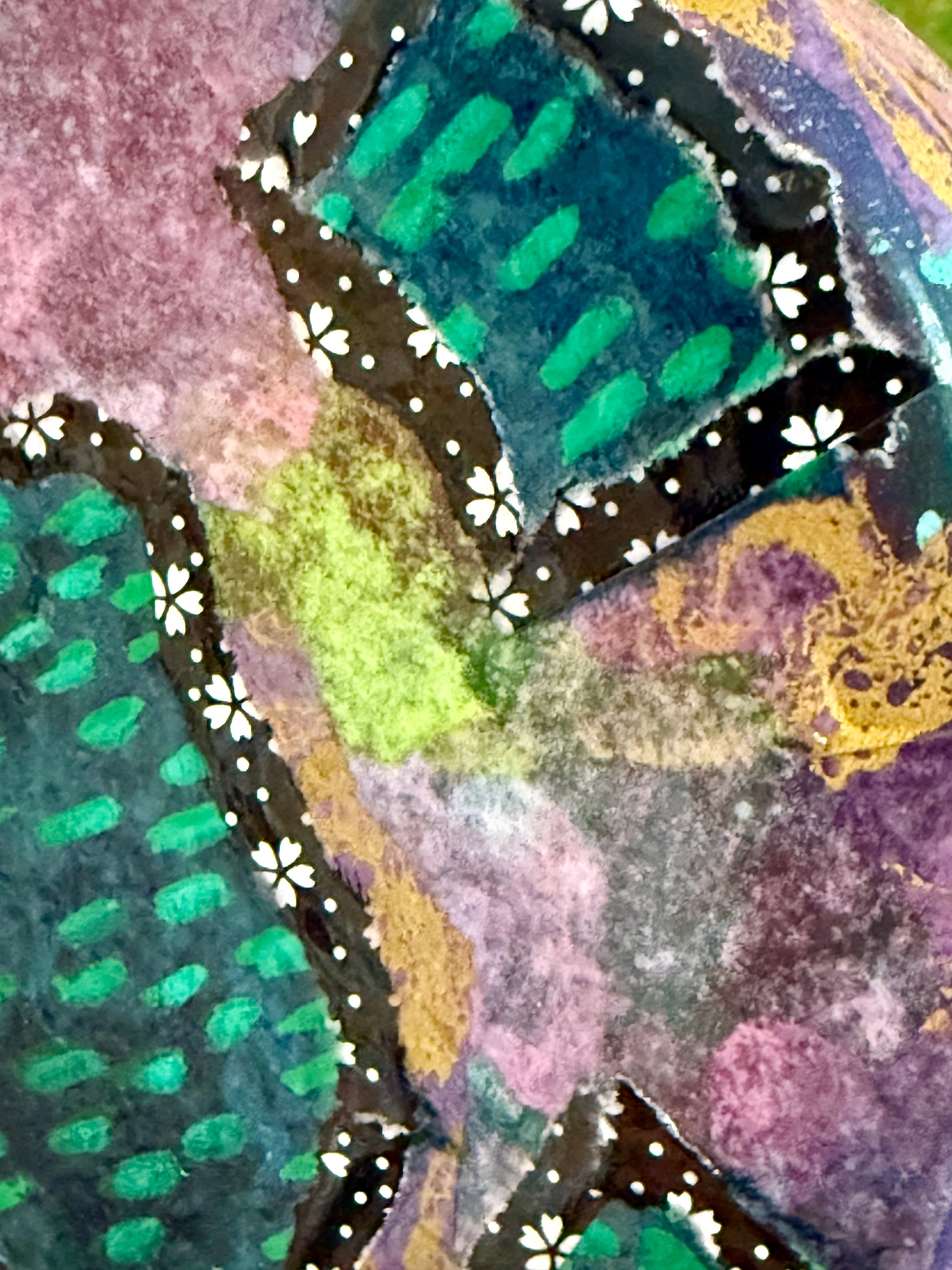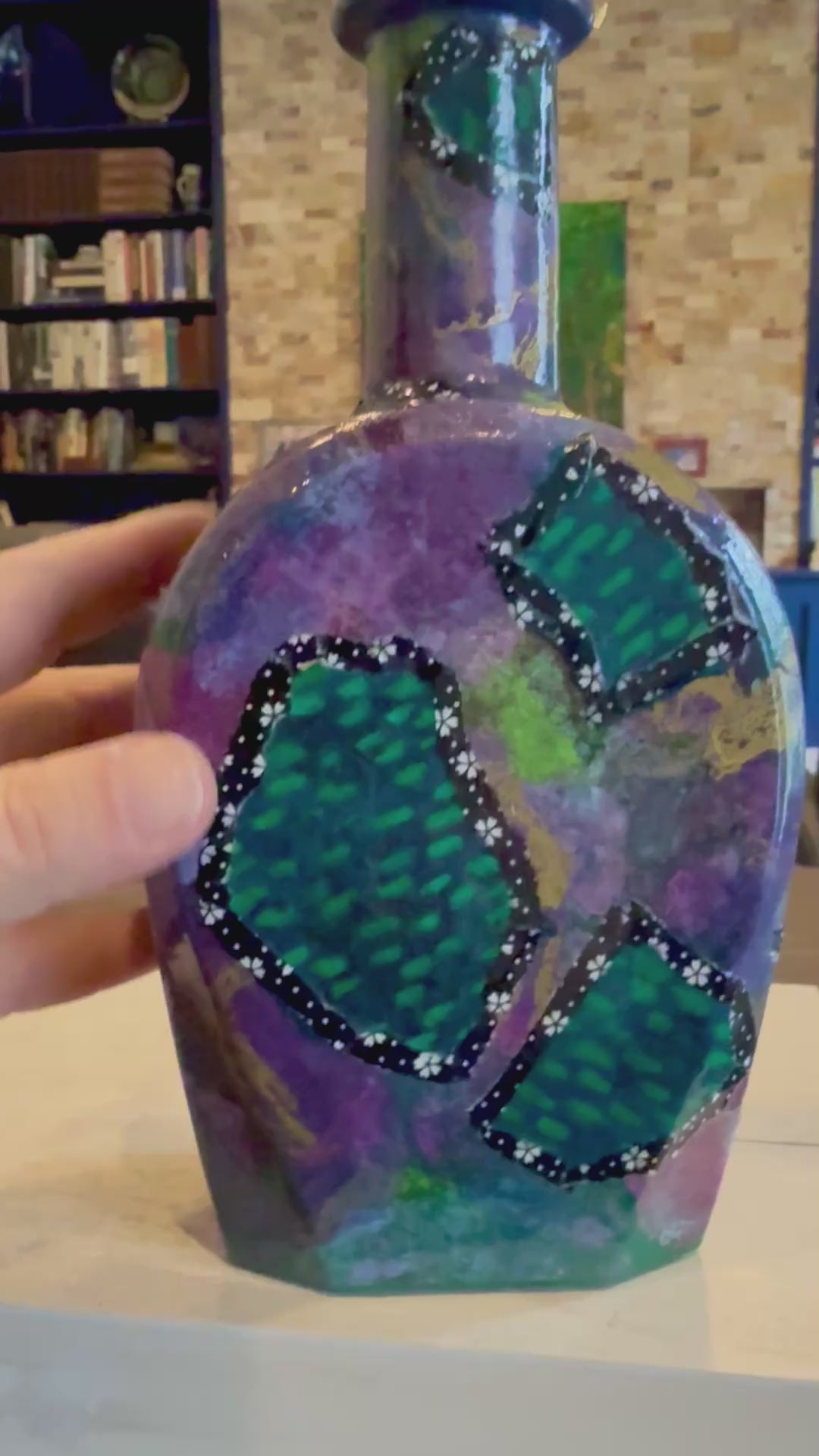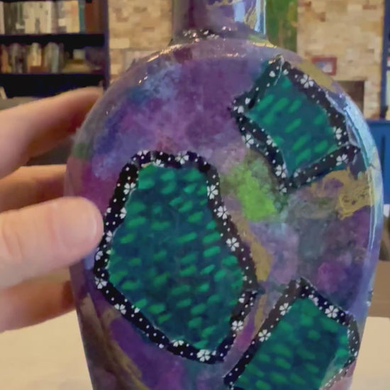 I have repurposed this bourbon bottle as a lively, maximalist flower vase with the help of colorful acrylic paint and scraps of paper.