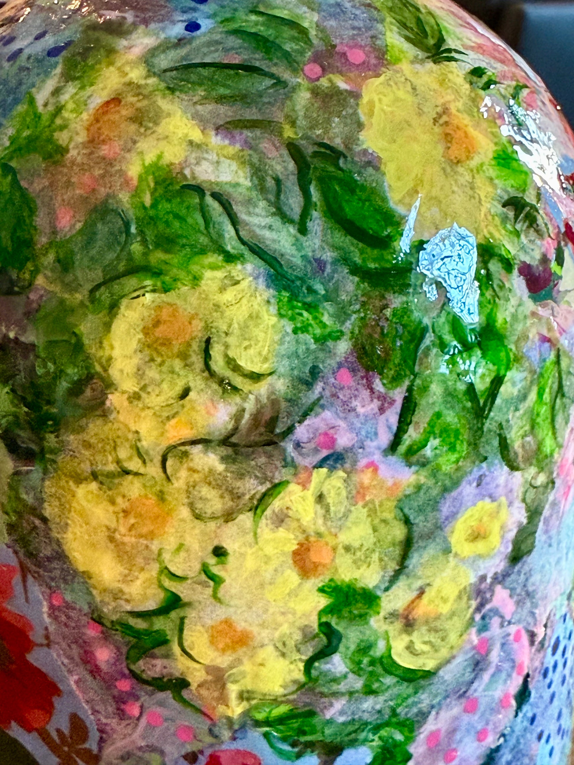 This isn't just any lamp - it's a colorful, floral table lamp made from a repurposed liquor bottle! I transformed a simple bourbon bottle into a stunning work of art using a mix of blue, green, yellow, and pink hues. I even added in some tissue scraps and wrapping paper for added texture. With a glossy finish and standing at a cool 20 inches tall with a 4-inch wide base, this lamp will brighten up any room. It takes a standard 60 watt bulb and comes with a harp. (Note: Lamp shade NOT included - but let's be real, it's already beautiful enough without it.)
