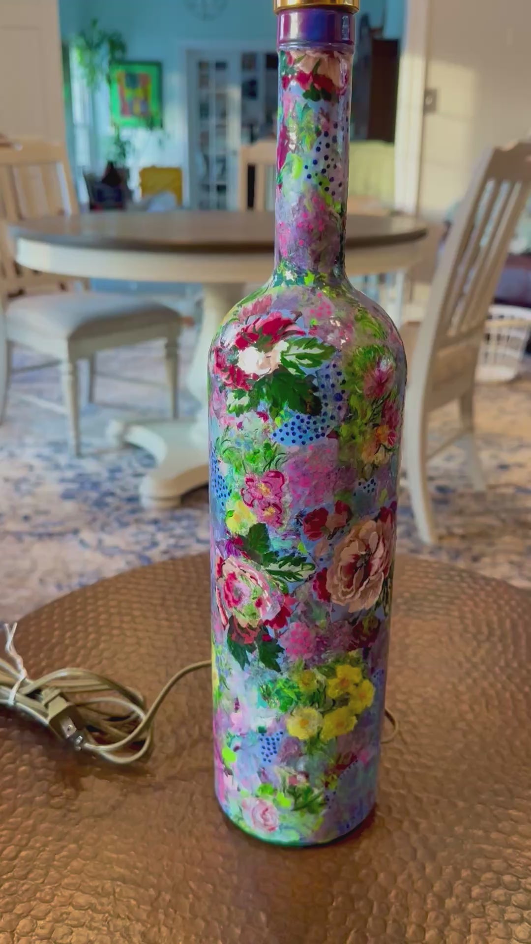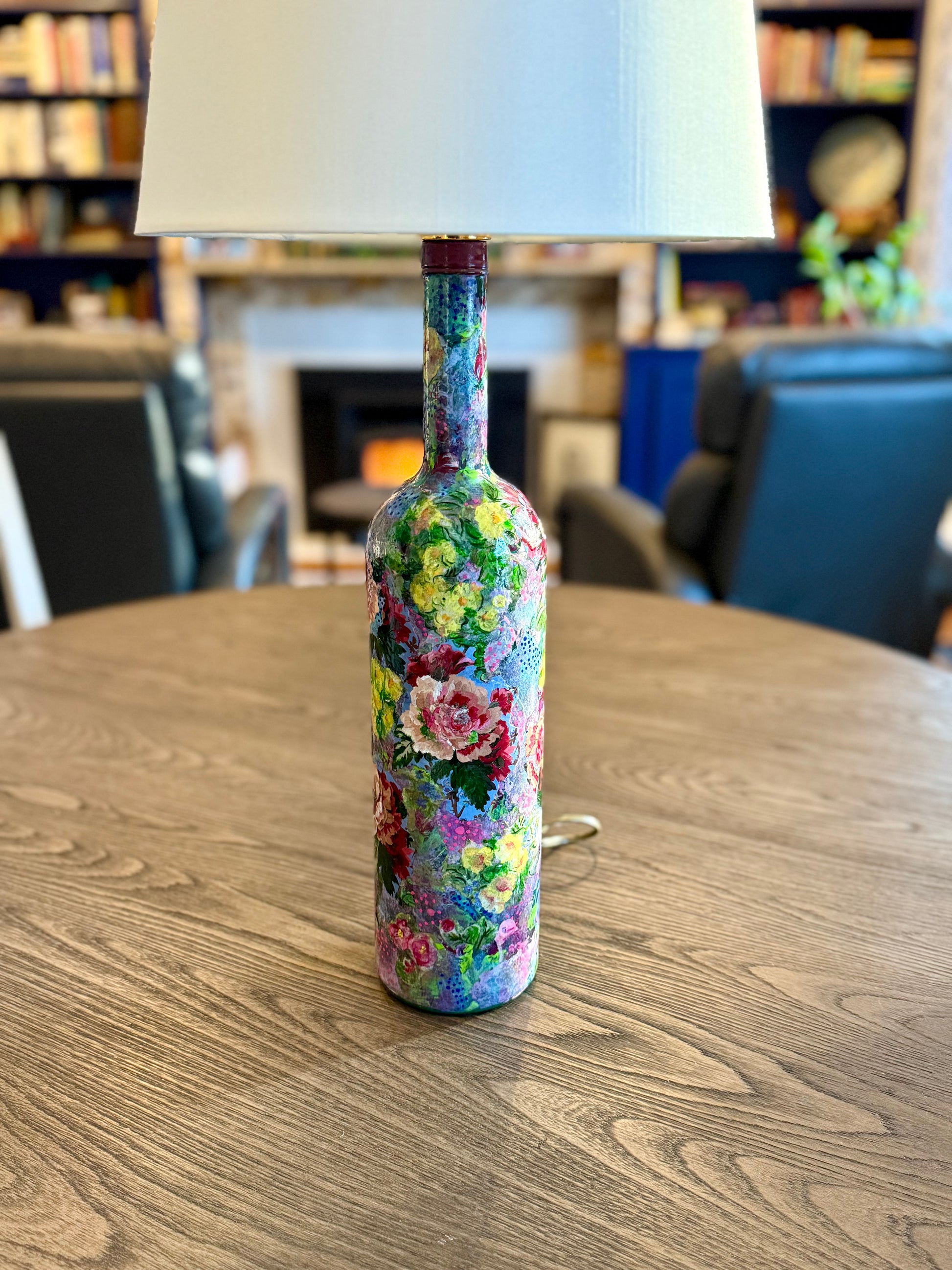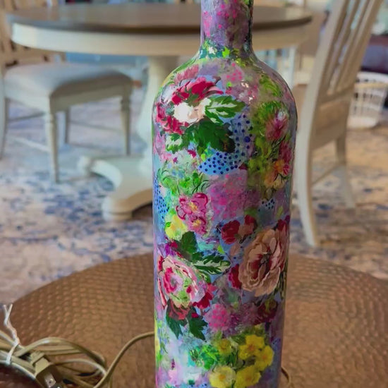 Colorful floral table lamp repurposed upcycled liquor bottle
