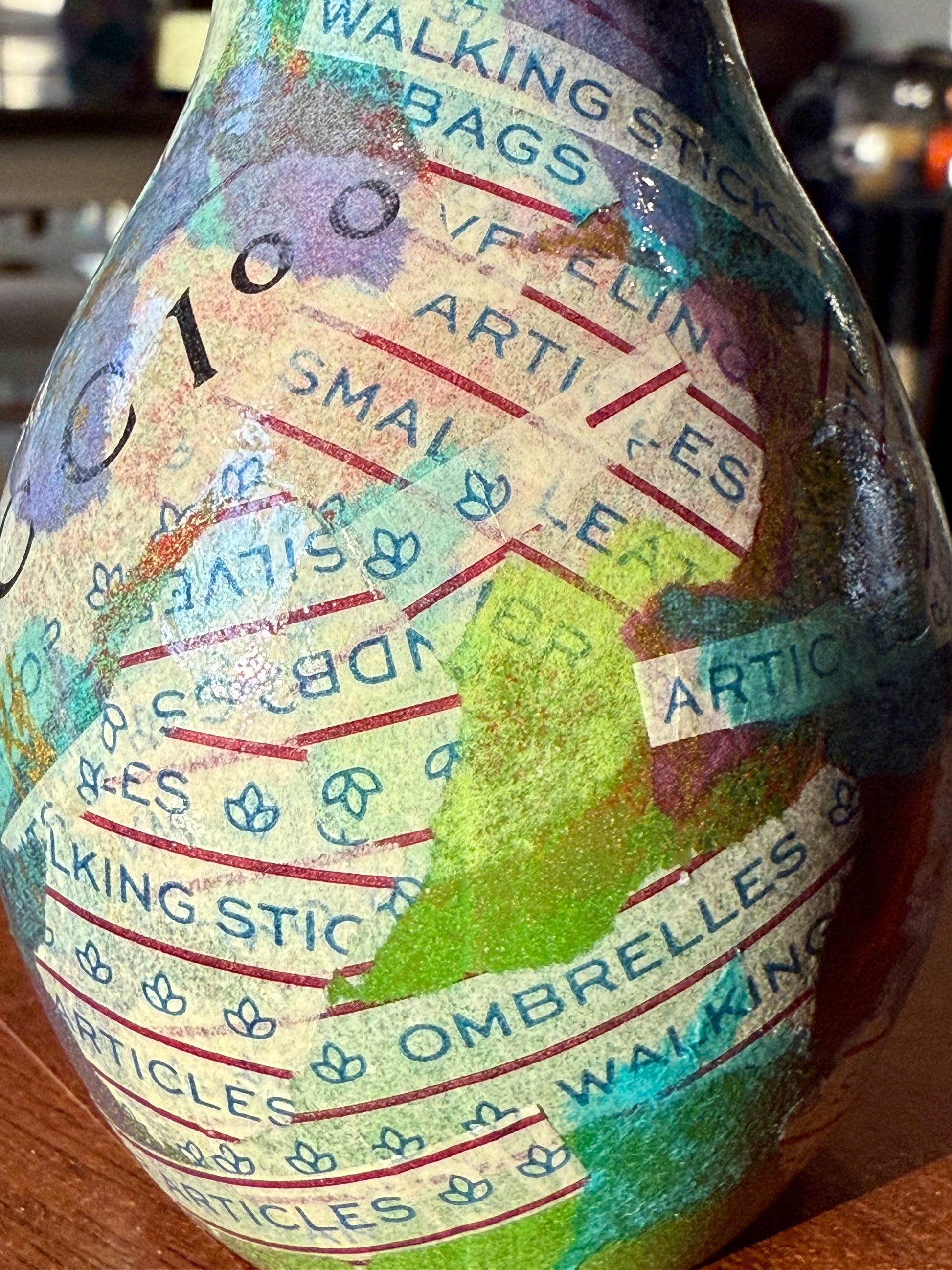 Transform your space with this whimsical upcycled bud vase that brings gallery-worthy style to any room. Crafted with vibrant acrylic paint and luxe designer tissue paper in jewel tones of blue, emerald, and purple, this hourglass beauty proves that sustainable design doesn't mean sacrificing sophistication. Perfect for displaying a single stem or small bouquet with serious flair.