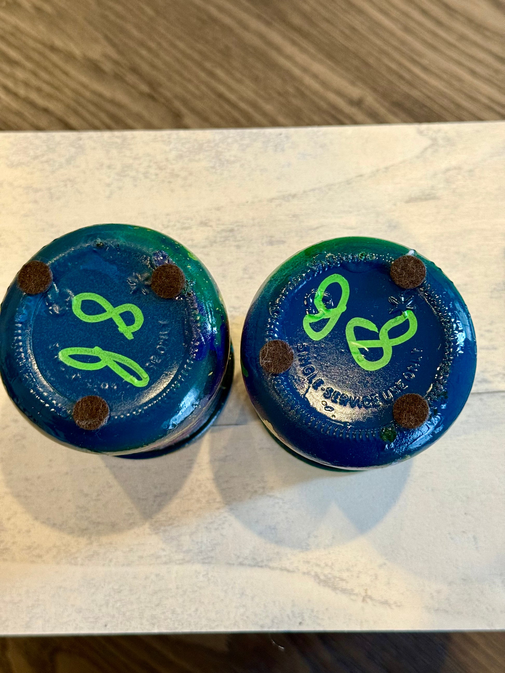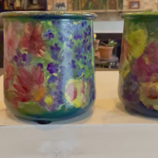 Add a touch of color and whimsy to your space with this pair of DIY votive candle holders. Handmade with yogurt jars, paper scraps and painted in jewel tones, each holder is uniquely designed for a maximalist style. Candles not included. Light up your room in style!